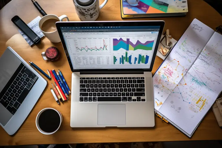 Zdjęcie stanowiska z komputerem, laptopem, i dwoma urządzeniami mobilnymi